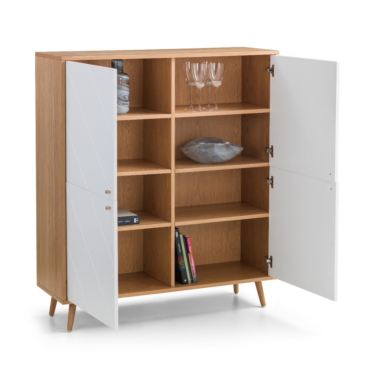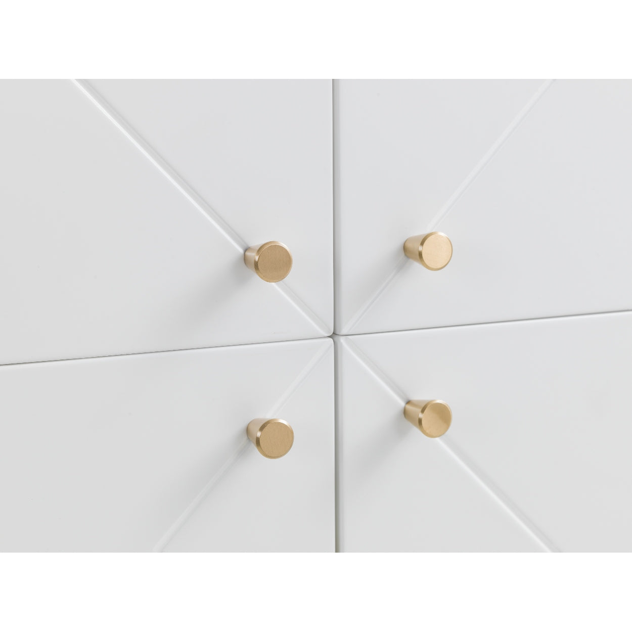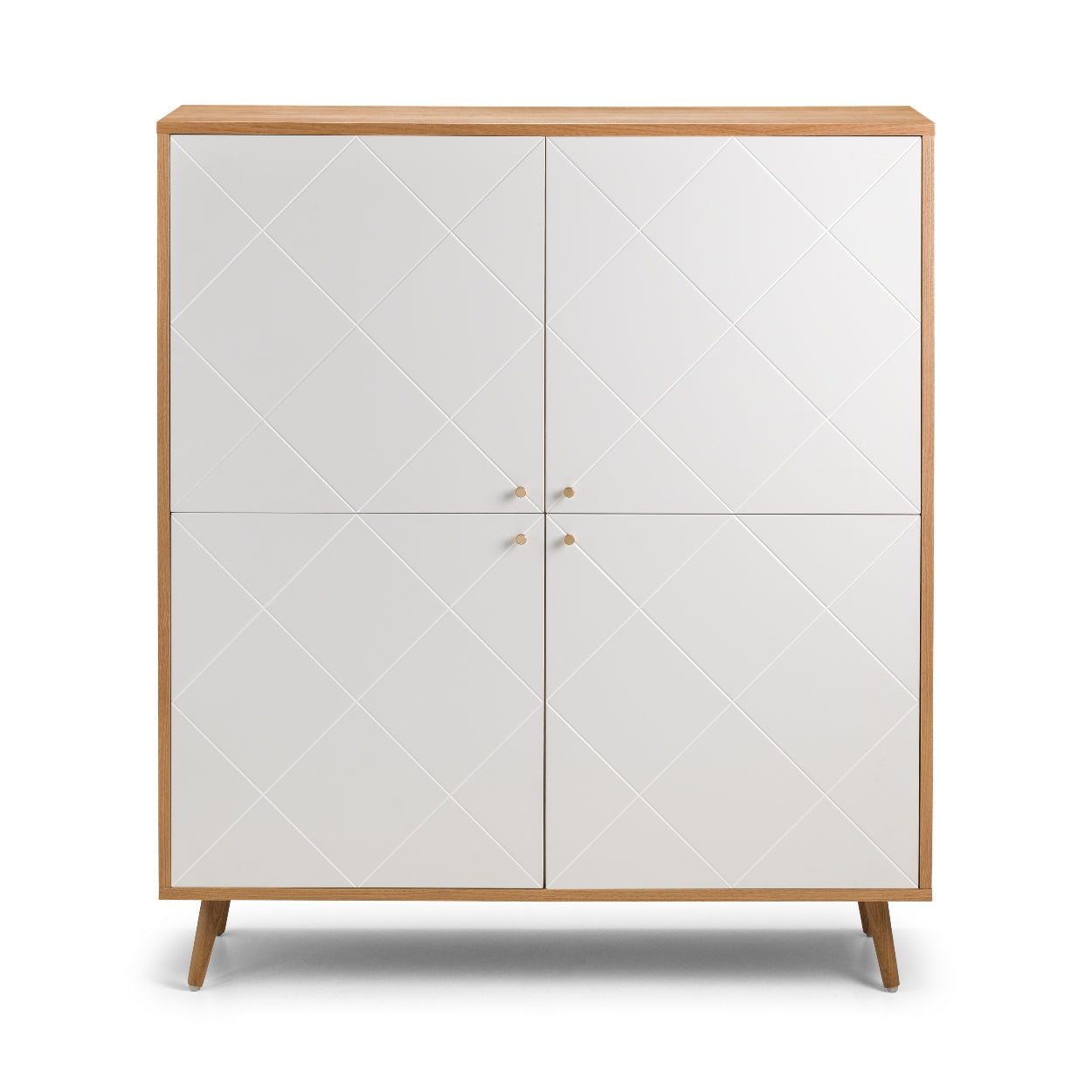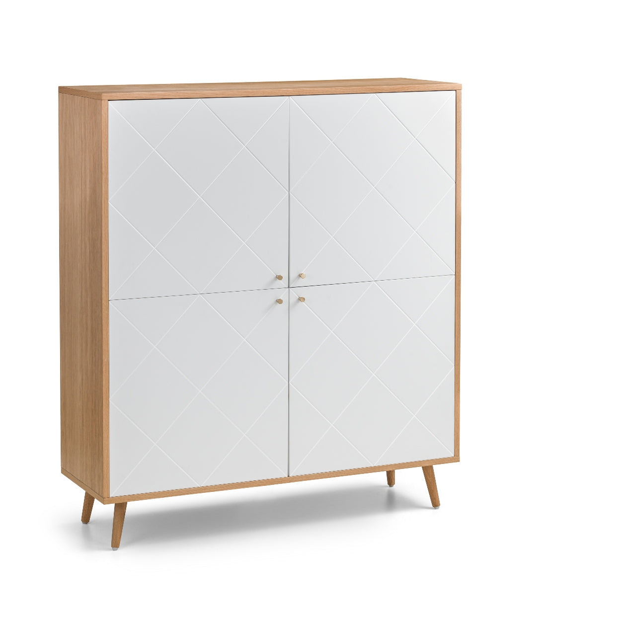 A subtle, yet striking linear pattern creates the eye-catching slickness of the Moritz 4 Door Cabinet. Finished with white door fronts, enhancing the geometry shadows from its contemporary design, with simplistic, yet stunning gold handles. The Moritz 4 Door Cabinet is available with white doors and a choice of white or oak effect sides and feet, offering great storage that looks good with any modern décor.