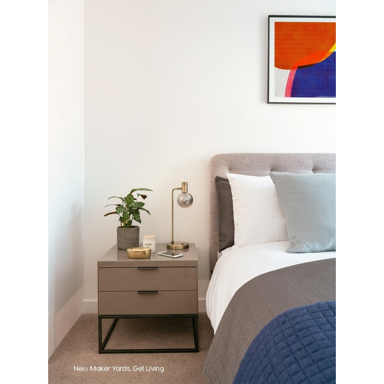 Designed to make a statement, the Santiago takes a classic shape and dares to go bolder with a dark grey powder-coated frame and a gunmetal lacquer body. We’ve fitted the Lustro with convenient bedside drawers, perfect for keeping the bedside tabletop clear of clutter. We then topped it with a protective layer of glass to keep your lacquer shining for the foreseeable future.