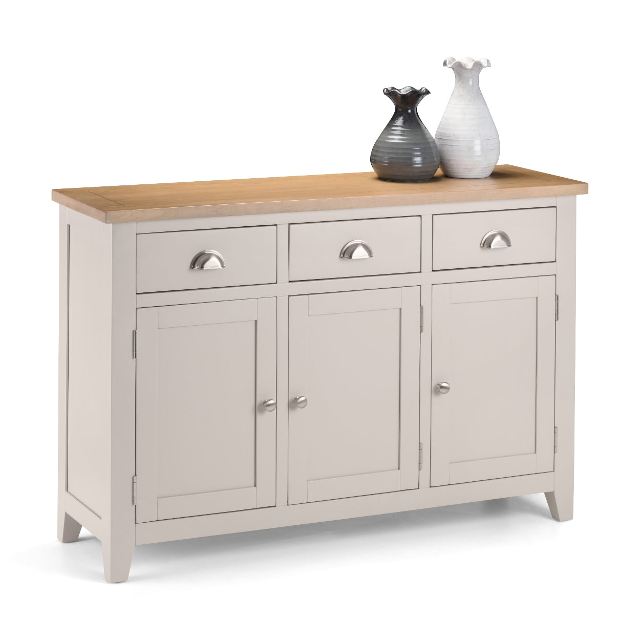 An elegant Sideboard, presented in an immaculate painted, soft Elephant Grey finish with beautiful pale oak top, crafted from a combination of high grade White Oak solids and veneers. This stylish piece looks beautiful and offers phenomenal storage for kitchen, living or dining room. Includes three practical drawers above a double and single cupboard space, accented with chic cupped handles in a brushed steel finish; ideal for cutlery , crockery and glassware. The combination of superior quality materials and classic design ensures a timeless appeal and fits perfectly alongside both traditional and contemporary decor. Part of the extensive Richmond Dining and Occasional furniture range from Julian Bowen.
