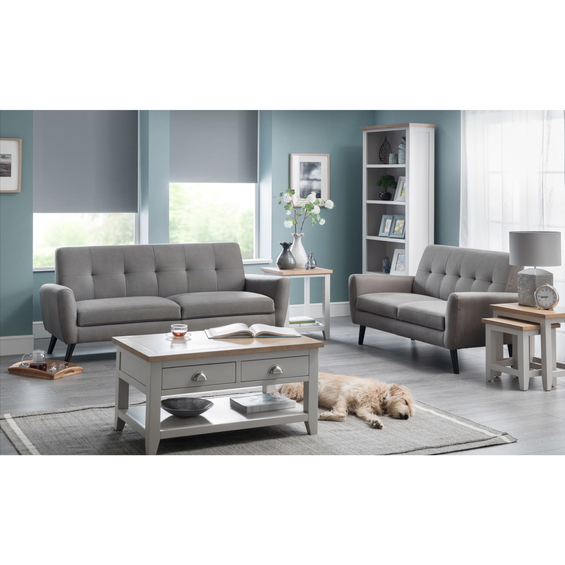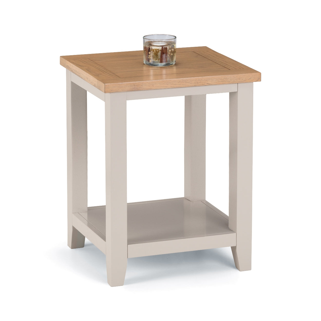 An elegant Lamp Table, presented in an immaculate painted, soft Elephant Grey finish with beautiful pale oak top, crafted from a combination of high grade White Oak solids and veneers. A stylish piece, whose combination of superior quality materials and classic design ensures a timeless appeal and fits perfectly alongside both traditional and contemporary decor. Richmond Lamp Table offers nice little storage area with additional lower shelf. Part of the extensive Richmond Dining and Occasional furniture range from Julian Bowen.