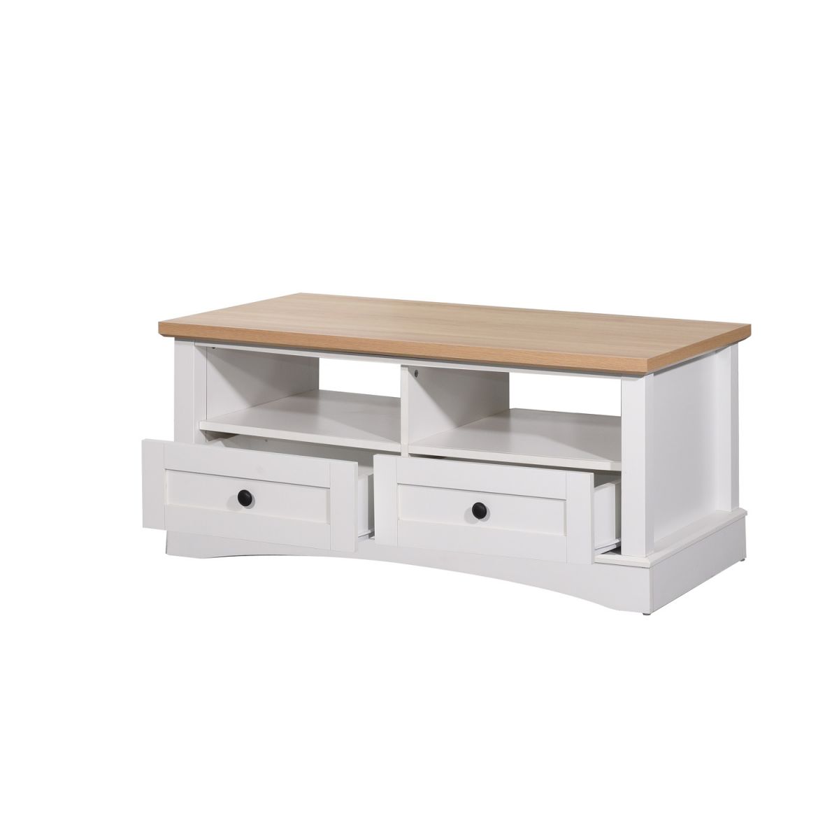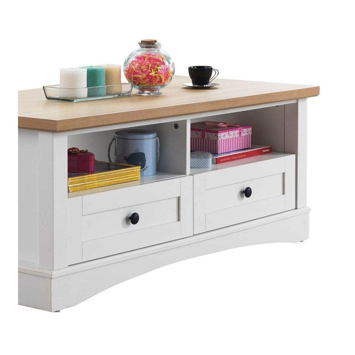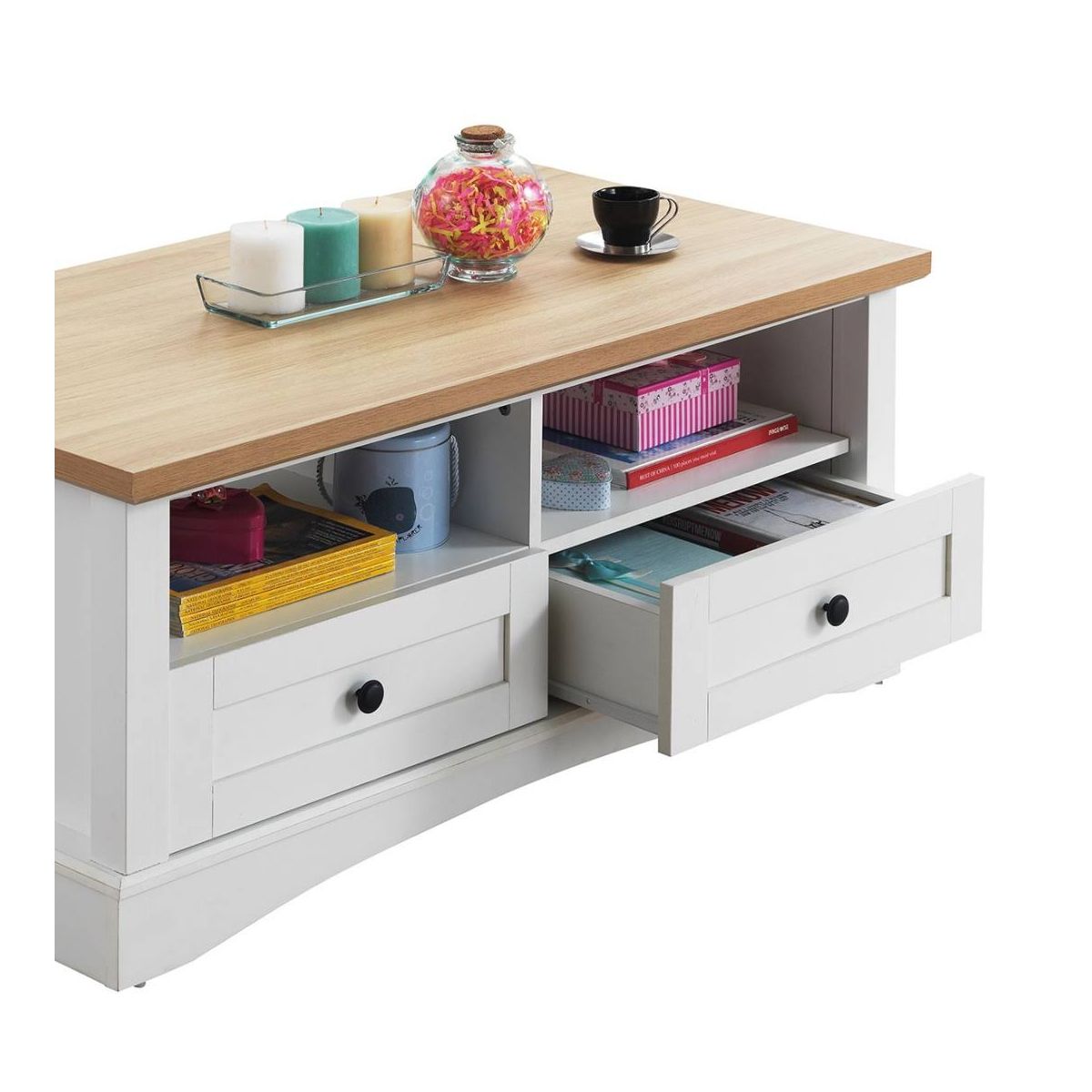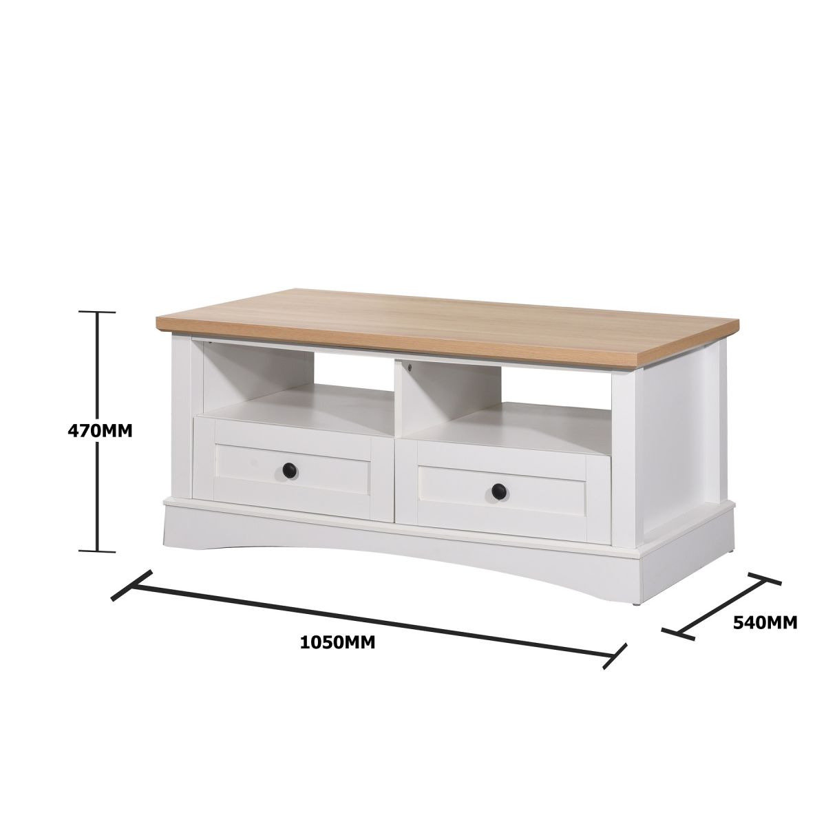 Cast your mind inside the British Country home, and visualise this stately offering. The Carden range is a testament to quality and refinement. This country-style wooden coffee table is finished in a modern white colour with a natural-look oak top. With 2 handy drawers and shelving space.