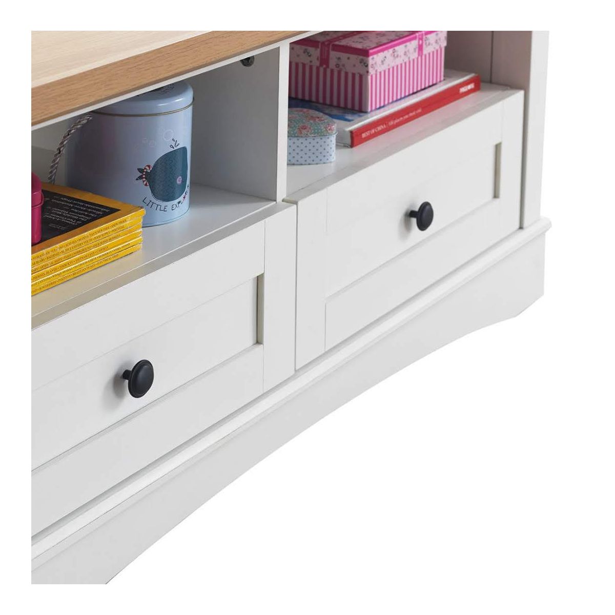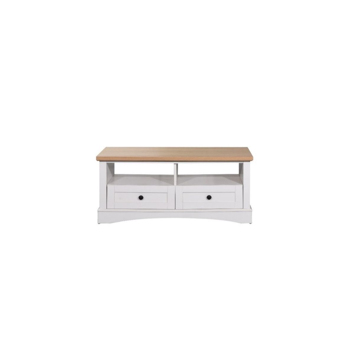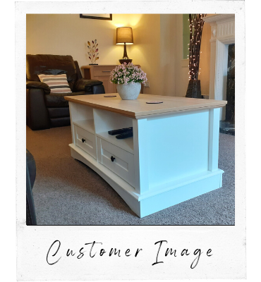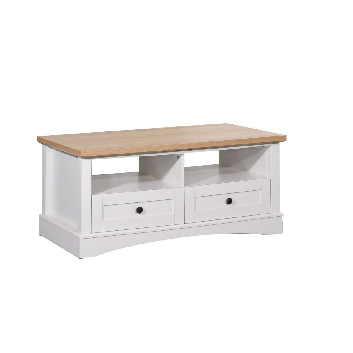 Cast your mind inside the British Country home, and visualise this stately offering. The Carden range is a testament to quality and refinement. This country-style wooden coffee table is finished in a modern white colour with a natural-look oak top. With 2 handy drawers and shelving space.