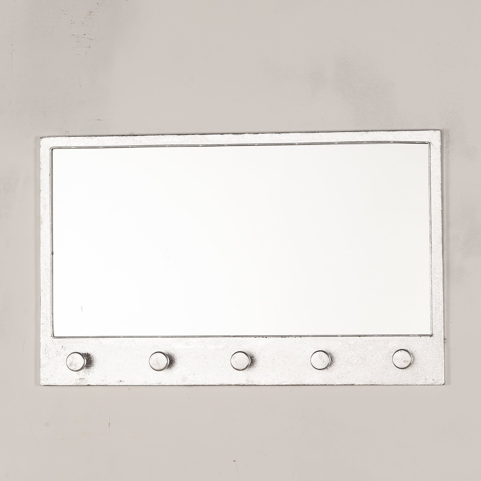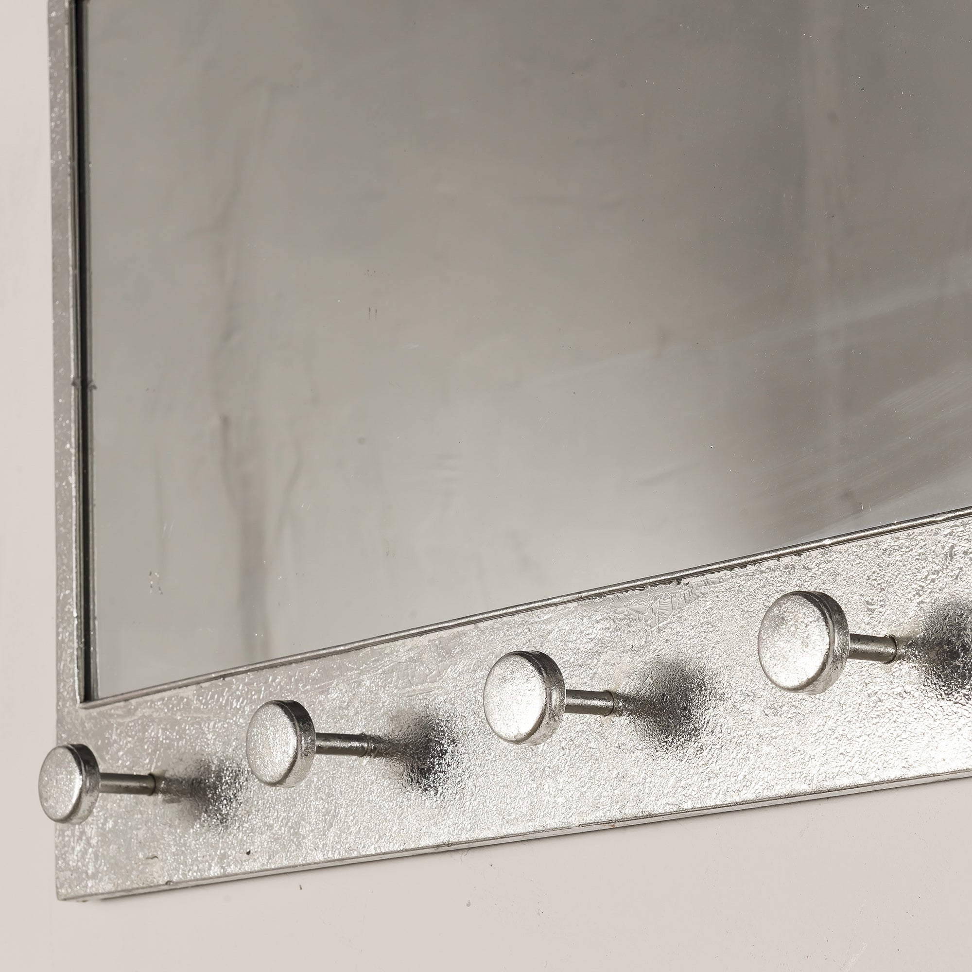 A Stylish Silver Gilt Leaf Parisienne Metal Mirror with round hooks for hanging items up. A unique and handy feature for your home.
