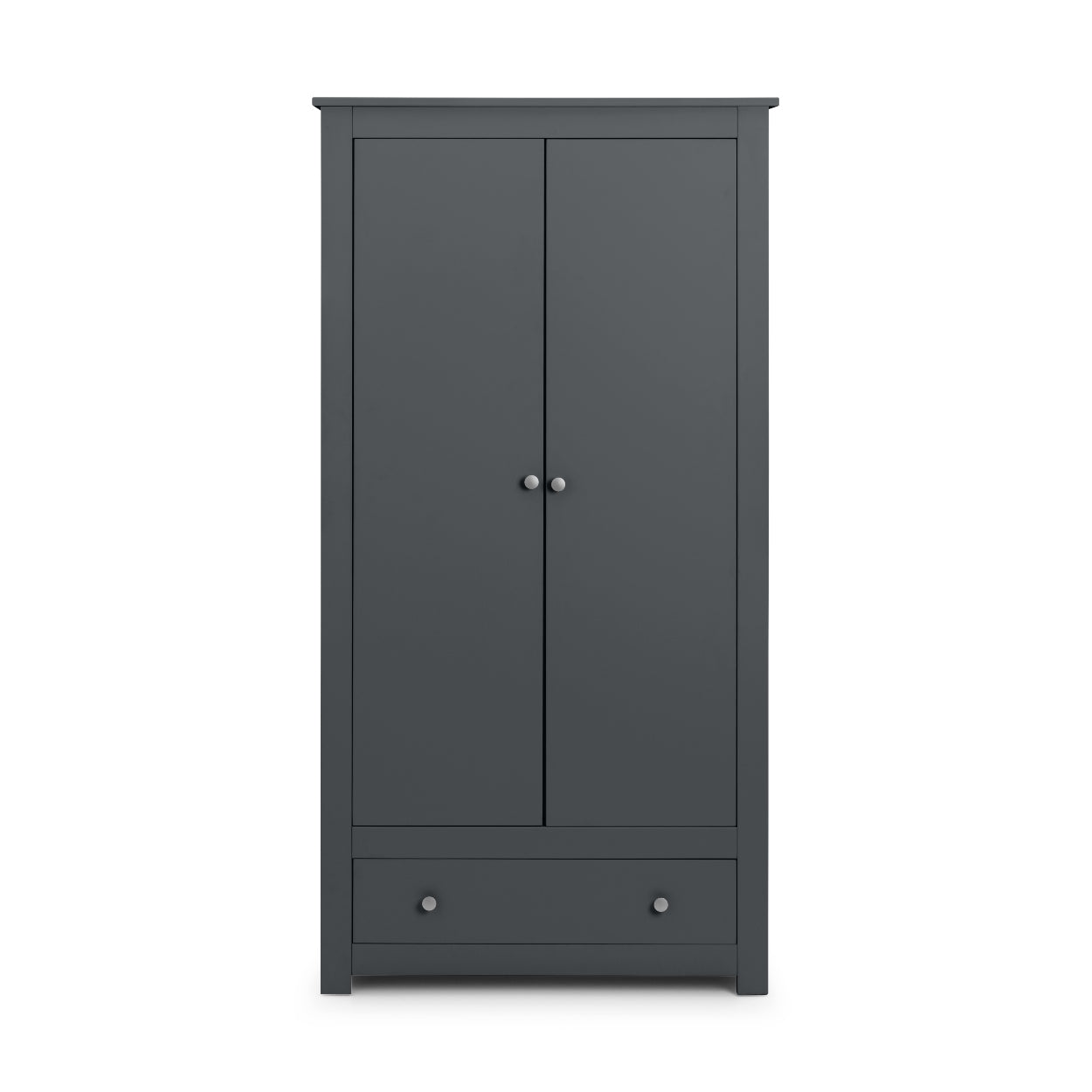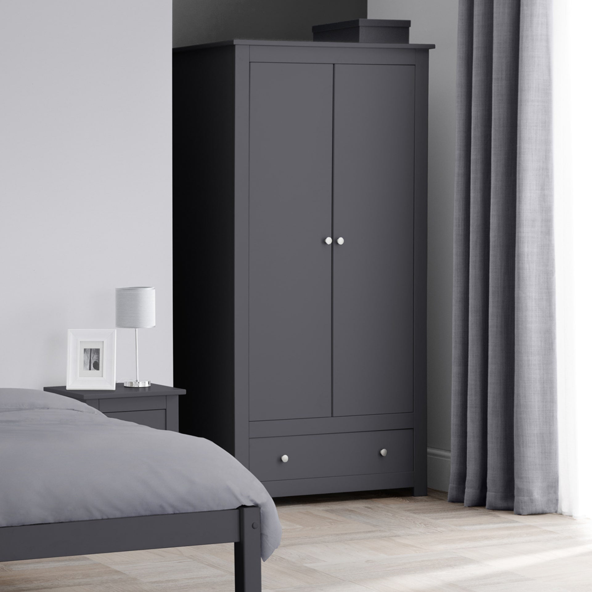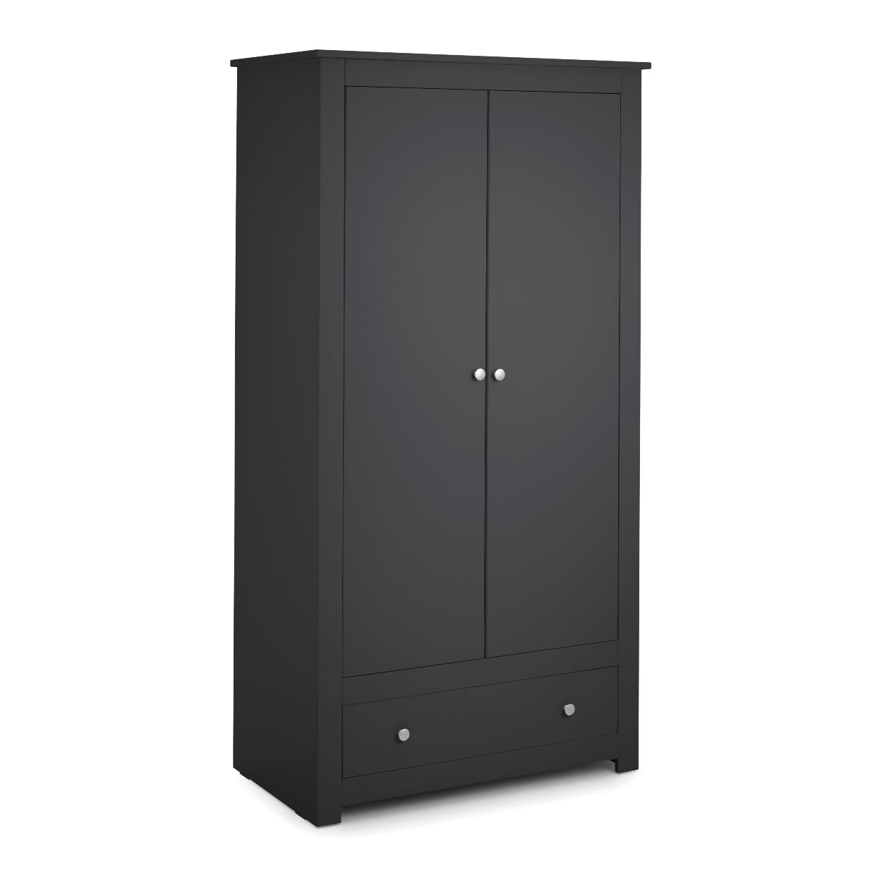 Boasting clean, simple lines the Radley wardrobe is perfectly suited for both modern or traditional styles. Featuring a hanging rail and a shelf behind 2 doors, and an additional storage drawer to store your clothes away neatly. Finished in 2 colour options - charcoal or white lacquer, with delicate silver handles, the Radley Bedroom Collection is perfect for adult and kid's bedrooms.
